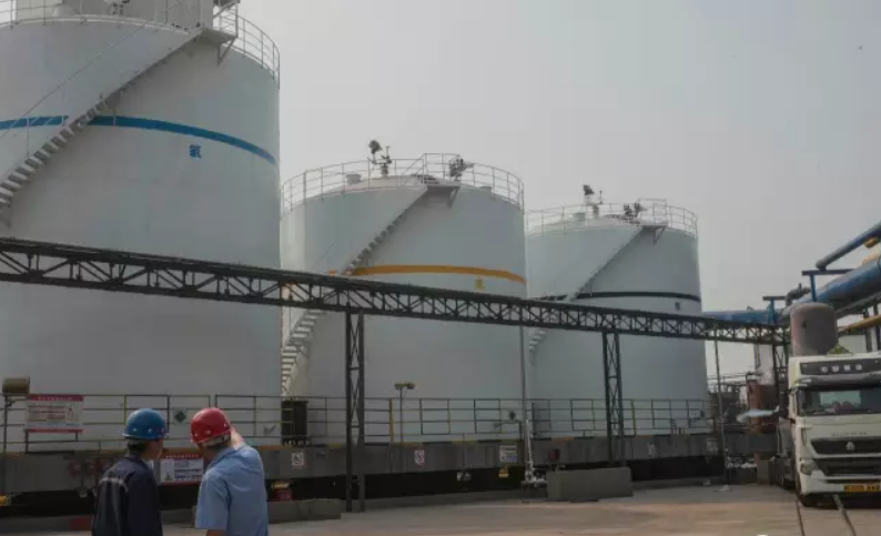 制氧廠存放氧氣、痰氣和氬氣的大罐,標注著不同的顏色。